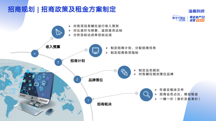 在招商調(diào)整階段,還可利用大數(shù)據(jù)對招商調(diào)整進行支撐,解決招調(diào)階段普遍存在的招商數(shù)據(jù)不足、規(guī)則不清晰的問題。在招商規(guī)劃階段,提供招商政策及租金方案制定,招商策略、租金計劃、收入預(yù)算支持。