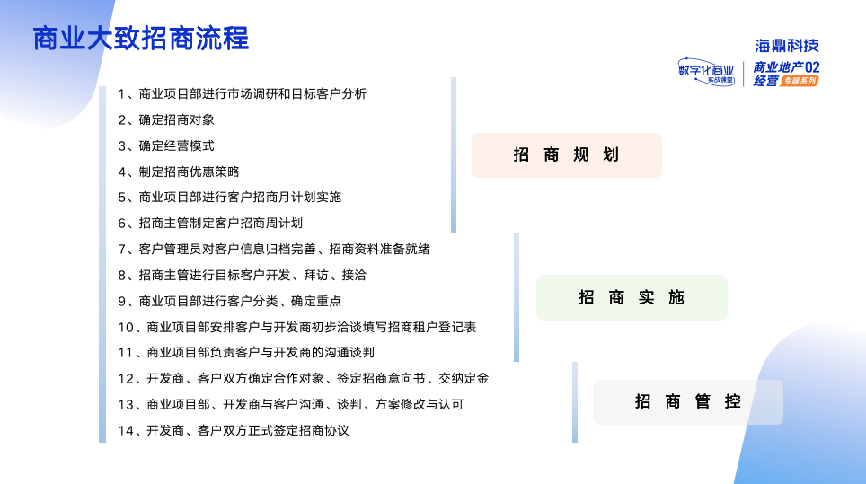 通常而言,商業(yè)項目的招商流程分為三個階段,包括:招商規(guī)劃、招商實施、招商管控。如何通過數(shù)字化能力助力招商,讓招商流程如虎添翼?