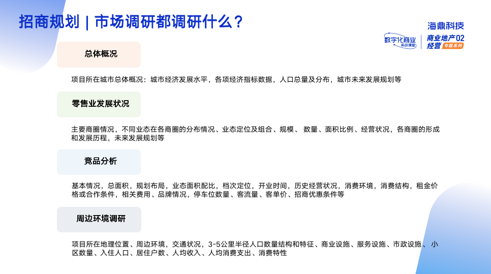 招商規(guī)劃的第一件事情是市場調(diào)研,主要調(diào)研內(nèi)容包括:總體概況、零售業(yè)發(fā)展狀況、競品分析、周邊環(huán)境調(diào)研等內(nèi)容,以此作為項目定位、商業(yè)業(yè)態(tài)規(guī)劃、租金標準測算、物管費測算、招商宣傳推廣費預(yù)算、組織架構(gòu)編制等依據(jù)。