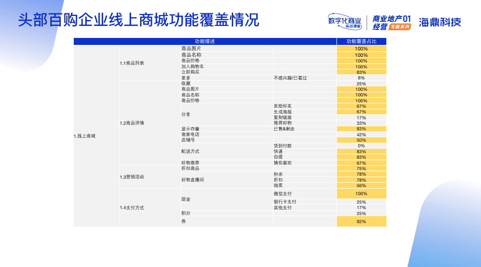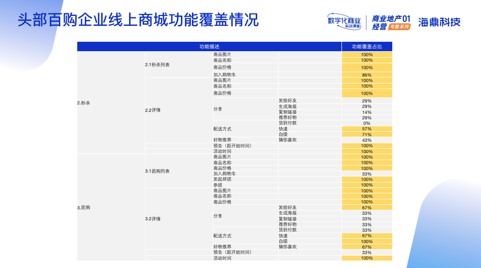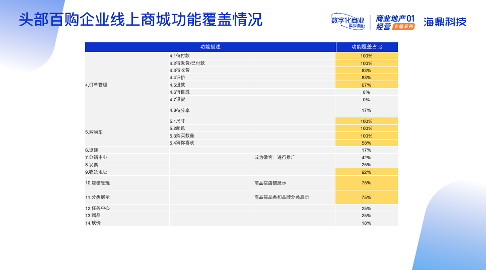 為了更好地幫助企業(yè)部署線上商城功能,提供參考方向。此次線上課堂特意收集了當前百購頭部企業(yè)的線上商城功能覆蓋情況。依據(jù)收集情況來看,頭部企業(yè)線上商城功能主要涵蓋商品展示、秒殺、團購、訂單管理、購物車、返現(xiàn)、分銷中心、發(fā)票等14大功能版塊。
