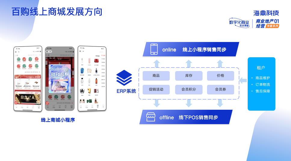 綜上所述百購的業(yè)務(wù)特點,百購線上商城發(fā)展方向一方面需要結(jié)合ERP系統(tǒng)打造線上線下一體化管理模式,將線下購物體驗云化運營,包括:商品庫存同步、價格一致、會員權(quán)益、營銷活動統(tǒng)一;另一方面,需要將租戶資源融合到線上運營,租戶自己就可以管理商品、訂單和物流,減輕運營成本,提升經(jīng)營效率。