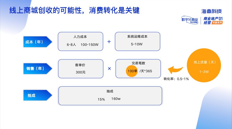 據(jù)統(tǒng)計,一般購物中心每天至少擁有1-2萬的客流量,在流量充足的情況下,轉(zhuǎn)化效率是關(guān)鍵。另外,由于線上商城系統(tǒng)在成本中占比不高,隨著運營的加深,成本分攤將會變得更低。