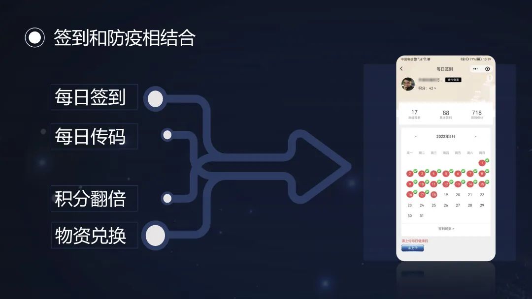 首先,紅星大衛(wèi)茂在會員系統(tǒng)中做了相應(yīng)的防疫小改動,新增每日上傳健康碼的功能,連續(xù)上傳積分能產(chǎn)生連擊效果,積分可以兌換防疫基礎(chǔ)物資,這項改動也得到了當(dāng)?shù)赜嘘P(guān)部門的認可和支持,在地方項目上被評為防疫先進集體。