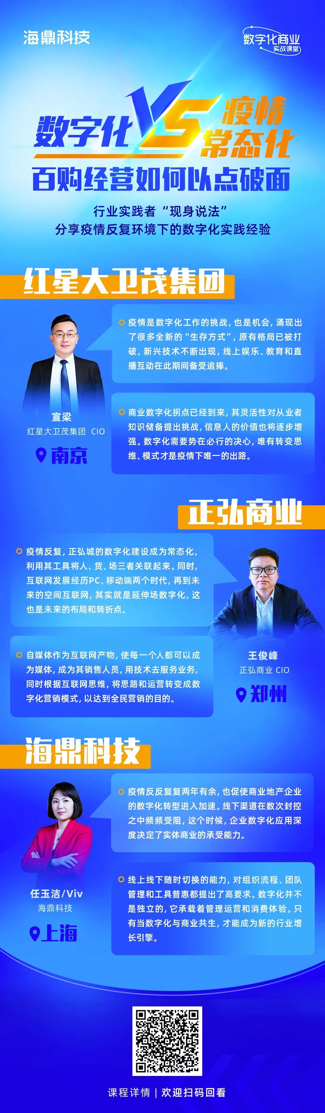 在此大環(huán)境下,海鼎科技于5月27日舉辦數(shù)字化商業(yè)實戰(zhàn)課堂第五期——《數(shù)字化VS疫情常態(tài)化·百購經(jīng)營如何以點破面》經(jīng)營專題系列課程,此次線上課堂邀請紅星大衛(wèi)茂集團CIO宣梁、正弘商業(yè)CIO王俊峰“現(xiàn)身說法”,分享疫情反復(fù)環(huán)境下的數(shù)字化實踐經(jīng)驗。