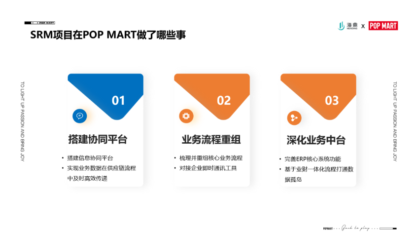 我們基于泡泡瑪特的需求,做了一些定制化的開發。SRM和H6相當于海鼎的兩個平行產品,我們基于我們的業務特性,把這張圖里邊列的一些關鍵場景在我們體系里面做一些實施。