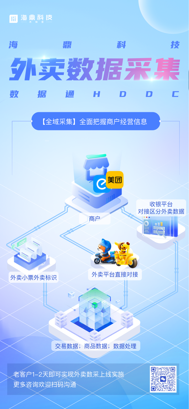 外賣數(shù)據(jù)通產(chǎn)品植根于海鼎科技數(shù)據(jù)通平臺,目前已對接美團(tuán)、餓了么兩大主流外賣平臺,外賣數(shù)據(jù)的獲取和存儲均滿足外賣平臺的安全合規(guī)要求。結(jié)合傳統(tǒng)的外賣小票采集方式,目前的外賣數(shù)據(jù)通產(chǎn)品可高效、精準(zhǔn)實(shí)現(xiàn)商戶外賣數(shù)據(jù)的采集工作。對于有需求的數(shù)據(jù)通老客戶,只需1-2個工作日即可更新上線。